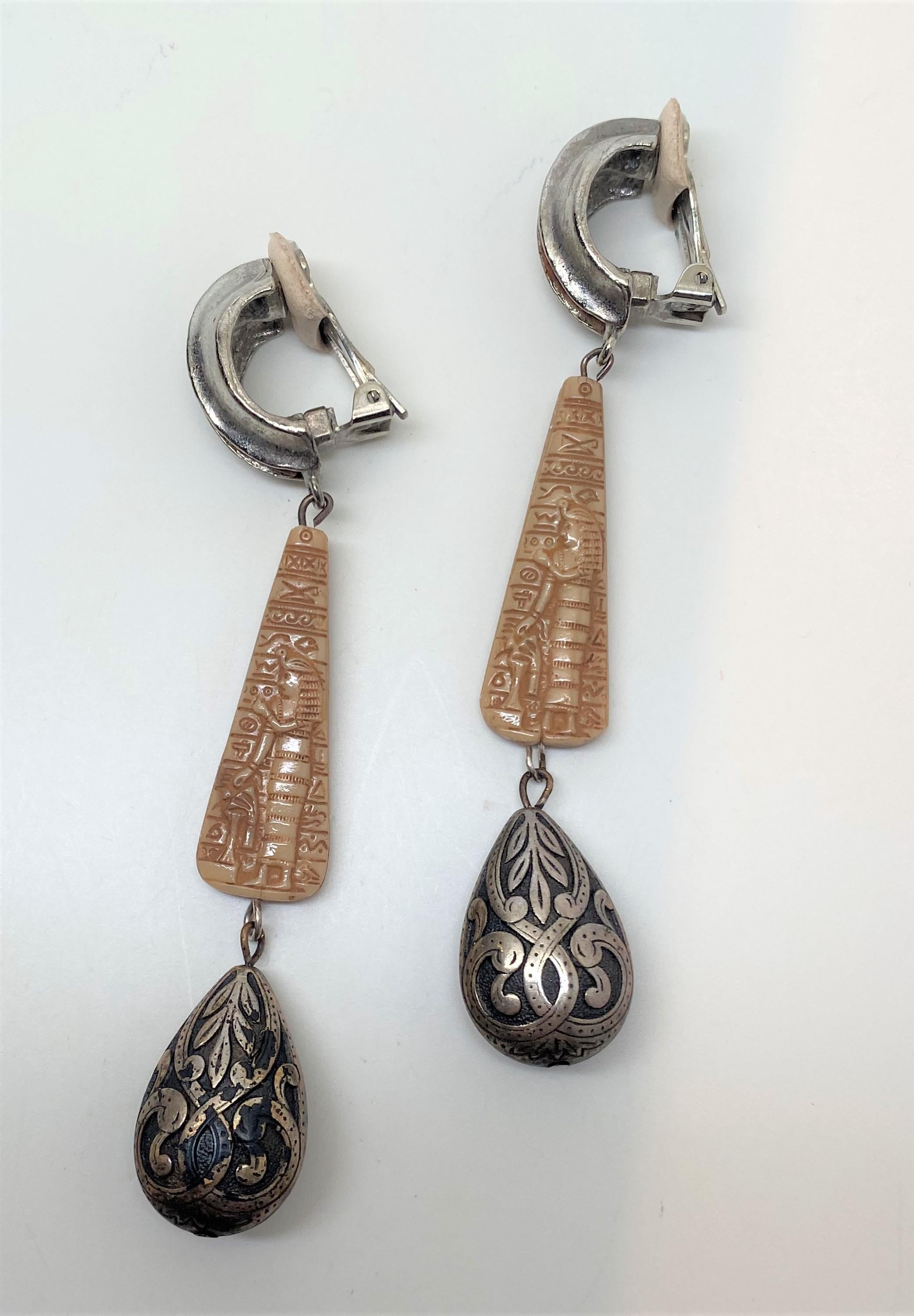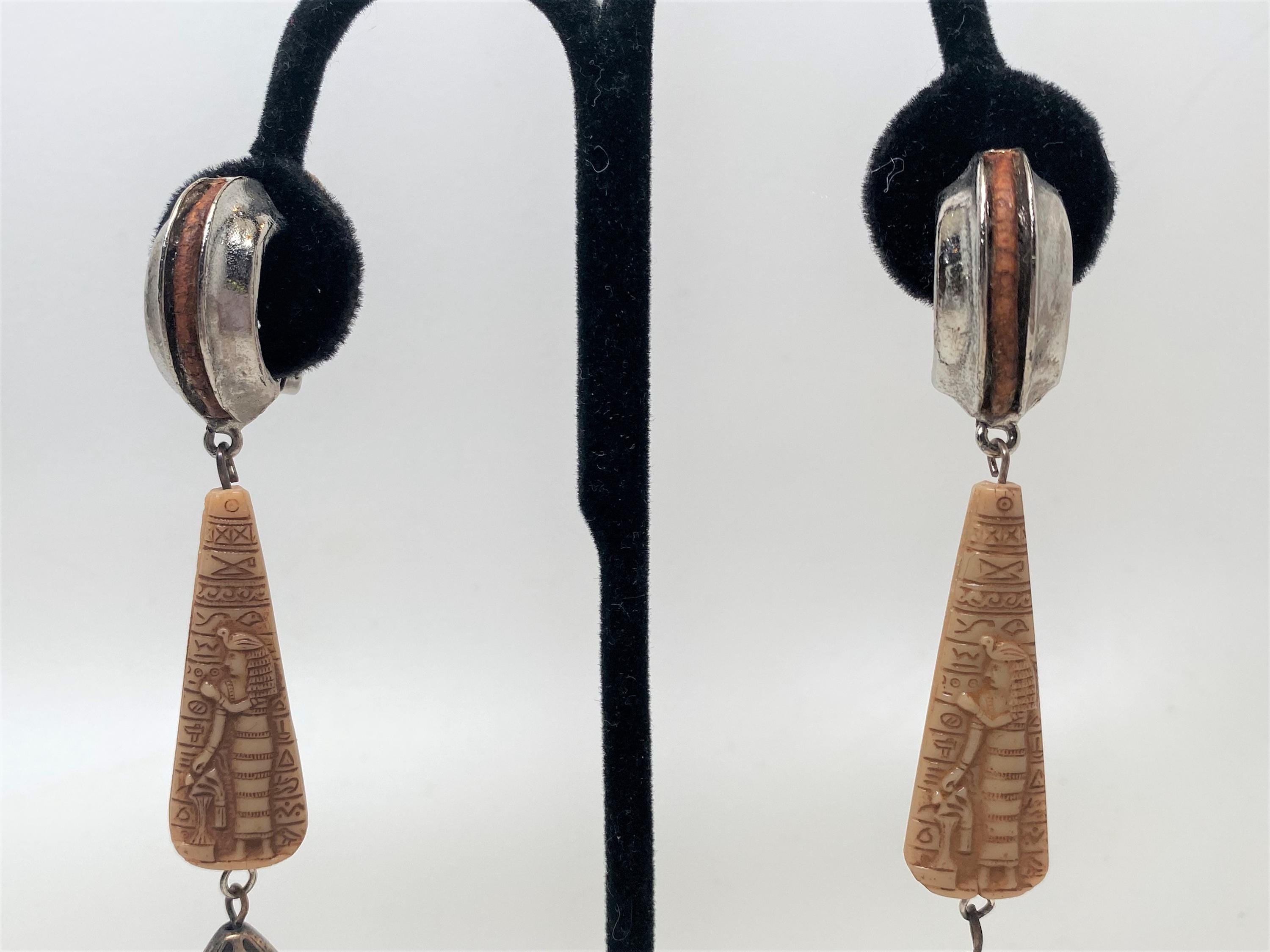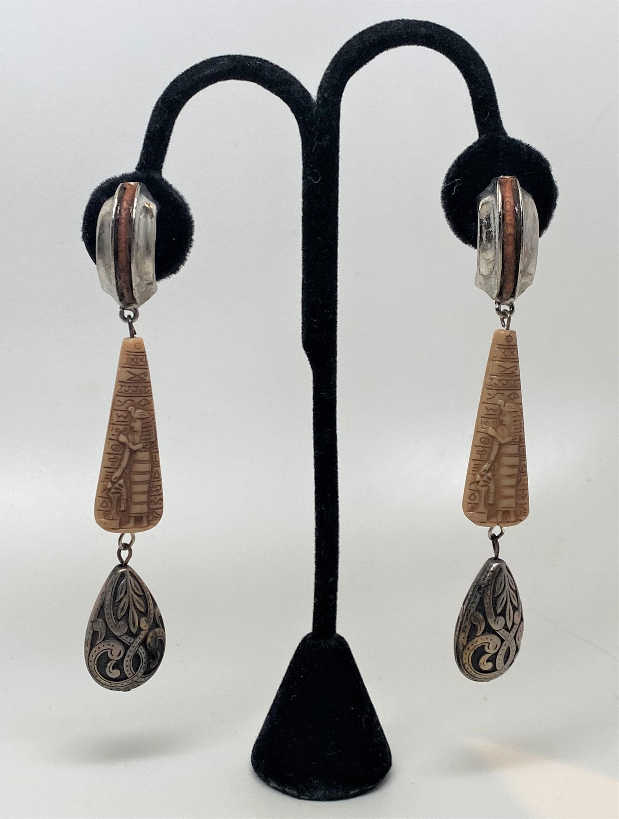 Vintage Silver Tone & Egyptian Scene Acrylic Clip on Dangle Earrings
