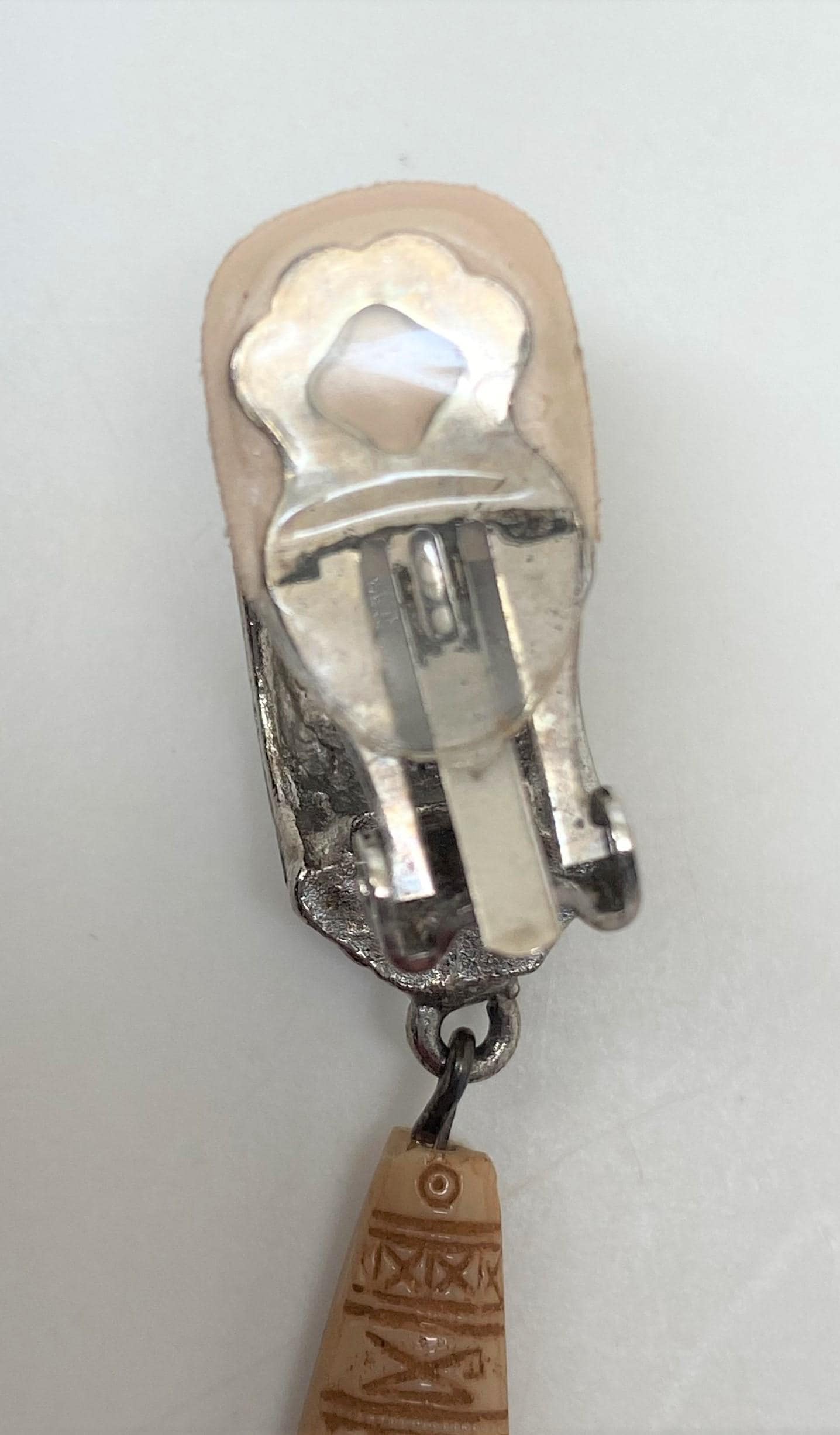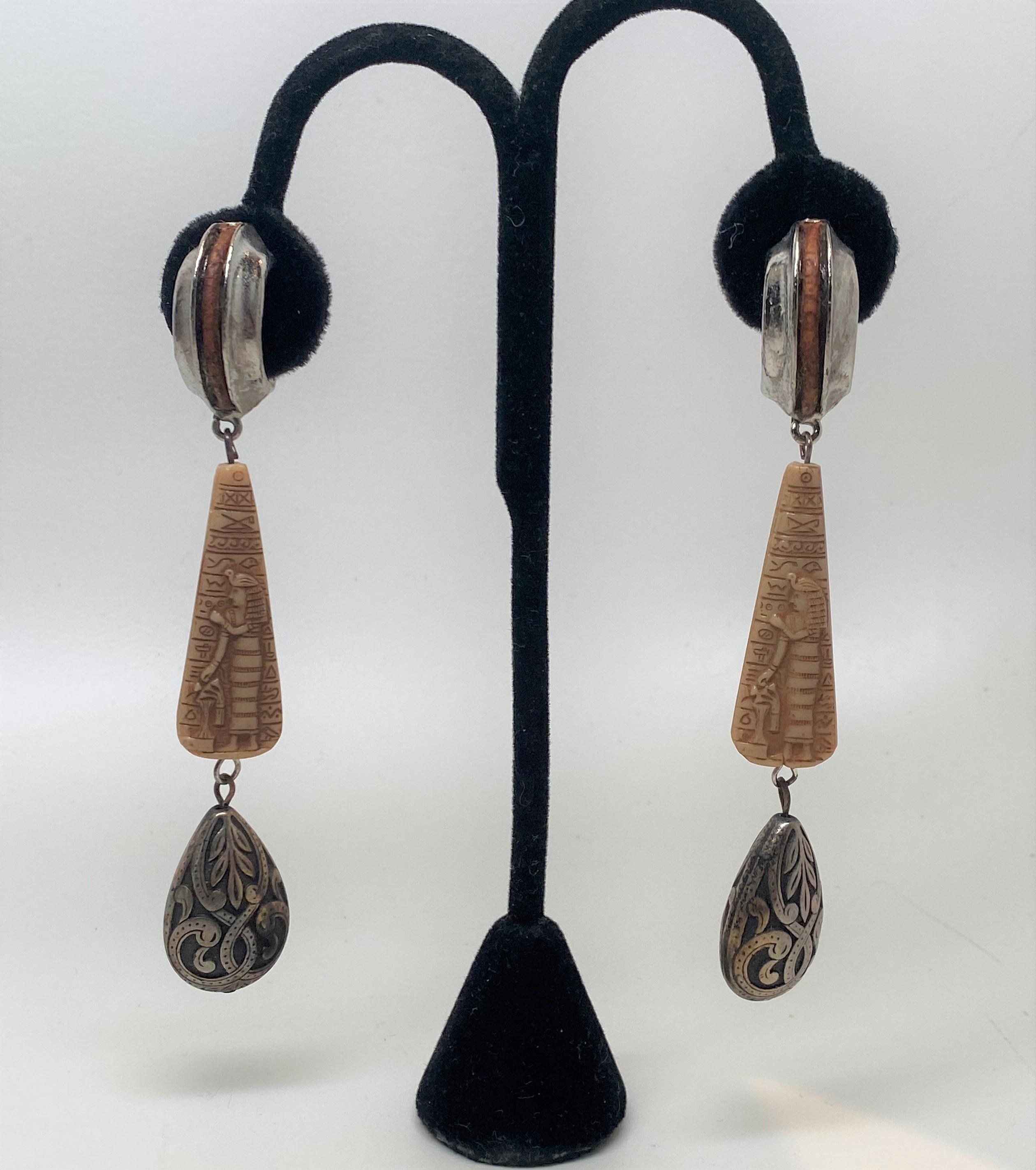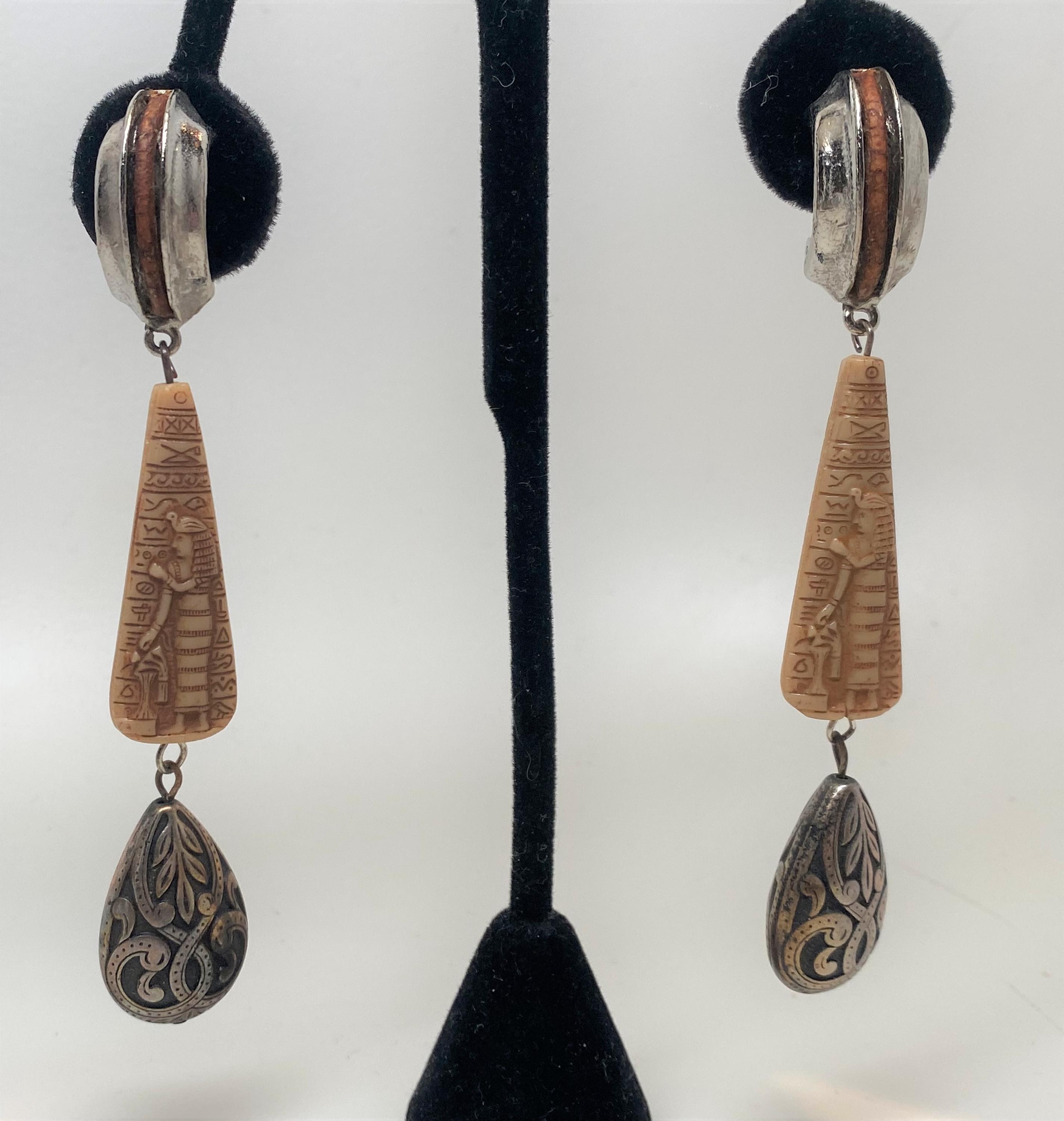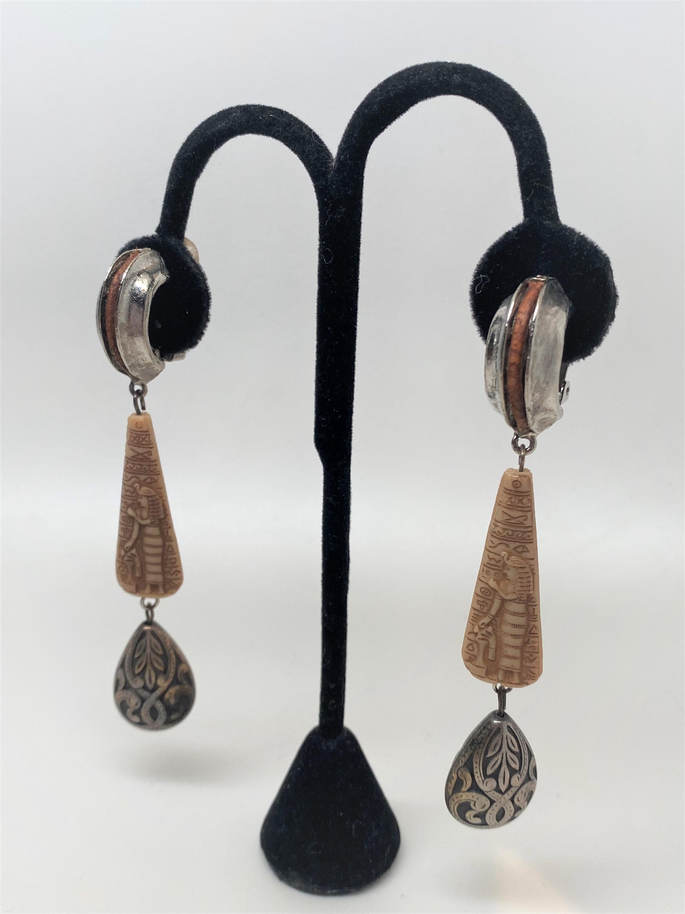 Vintage Silver Tone & Egyptian Scene Acrylic Clip on Dangle Earrings