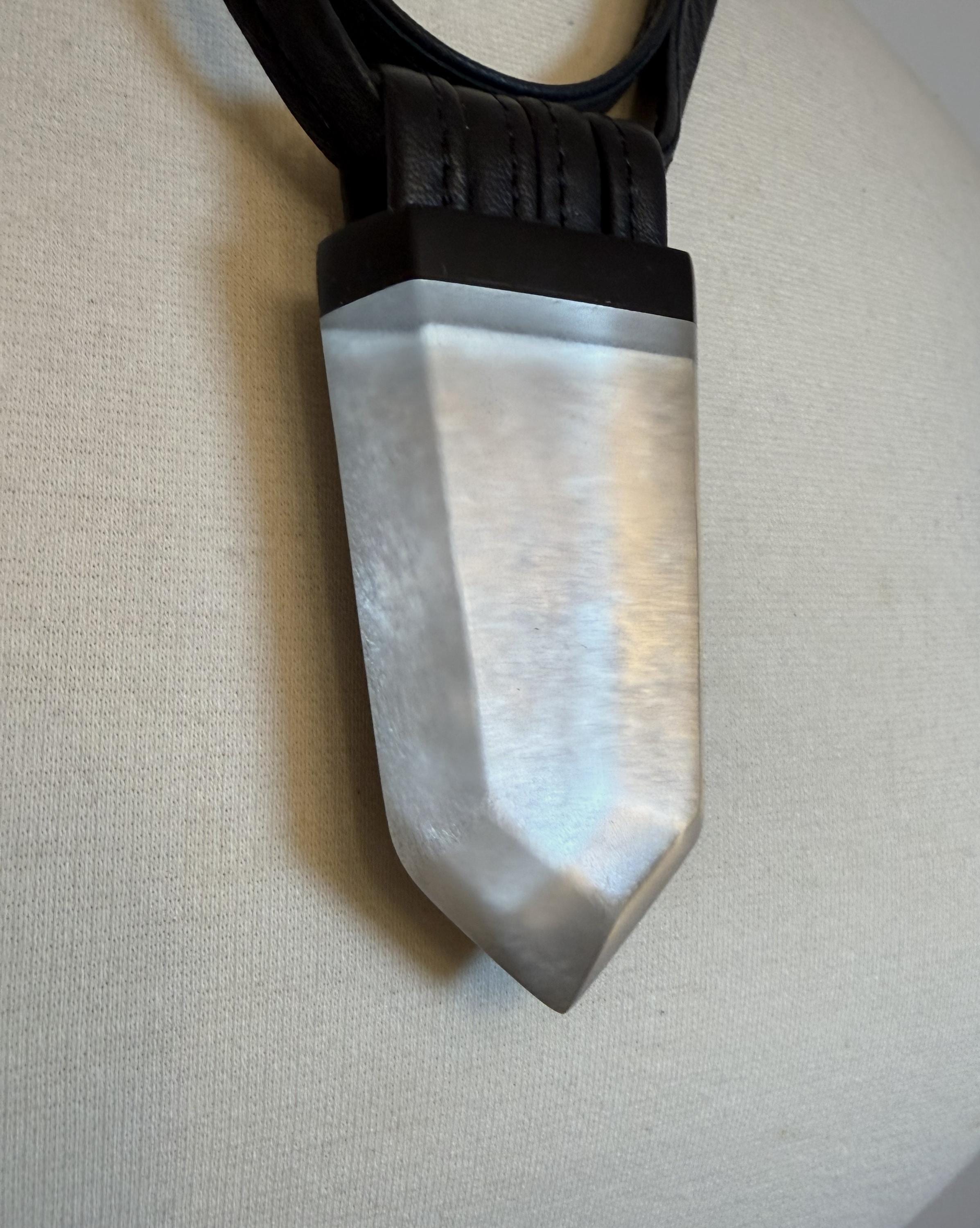 The necklace features long leather strand with modernistic style, polished to perfection,