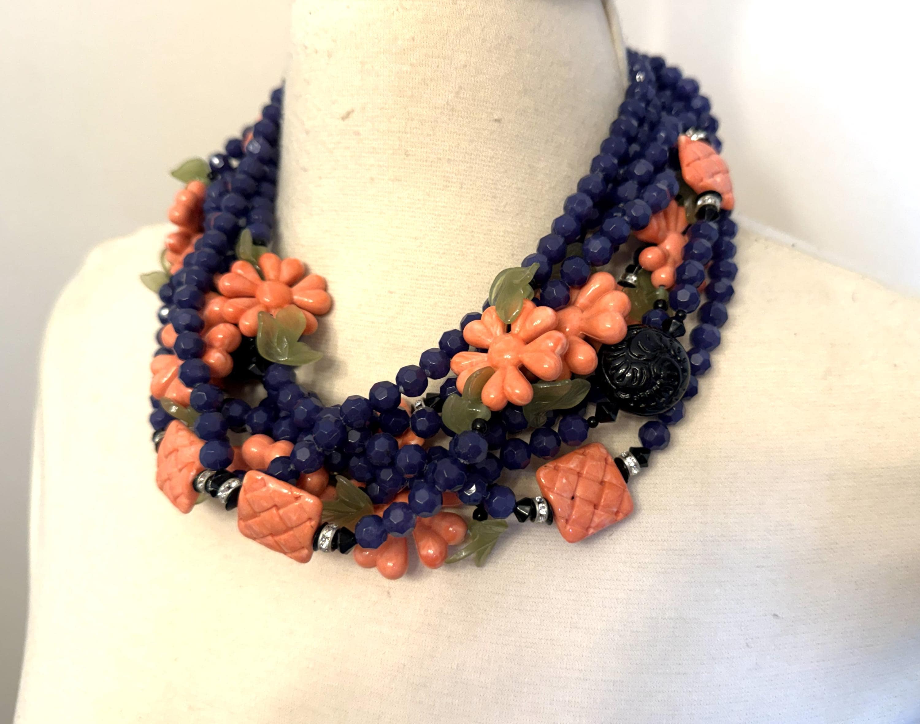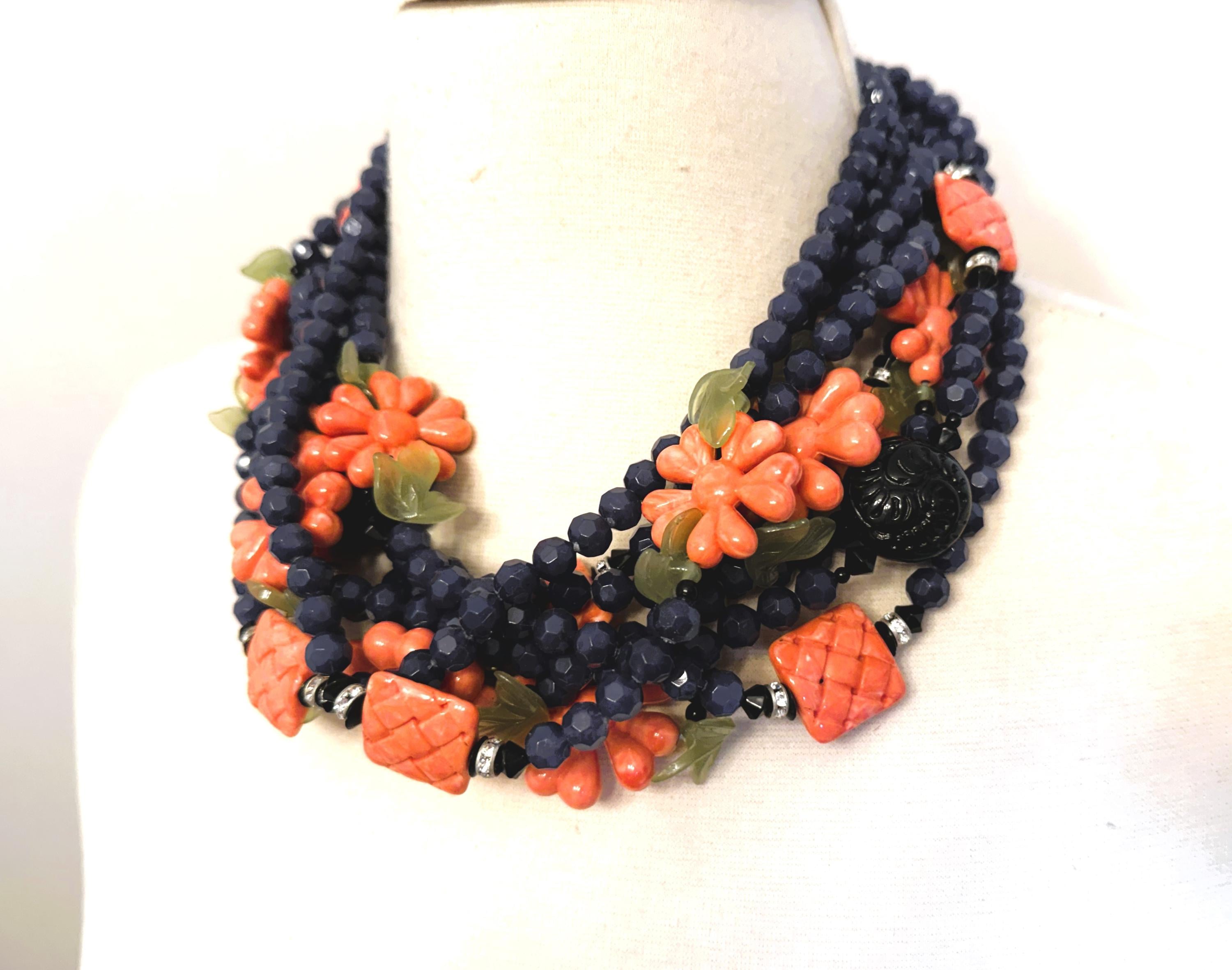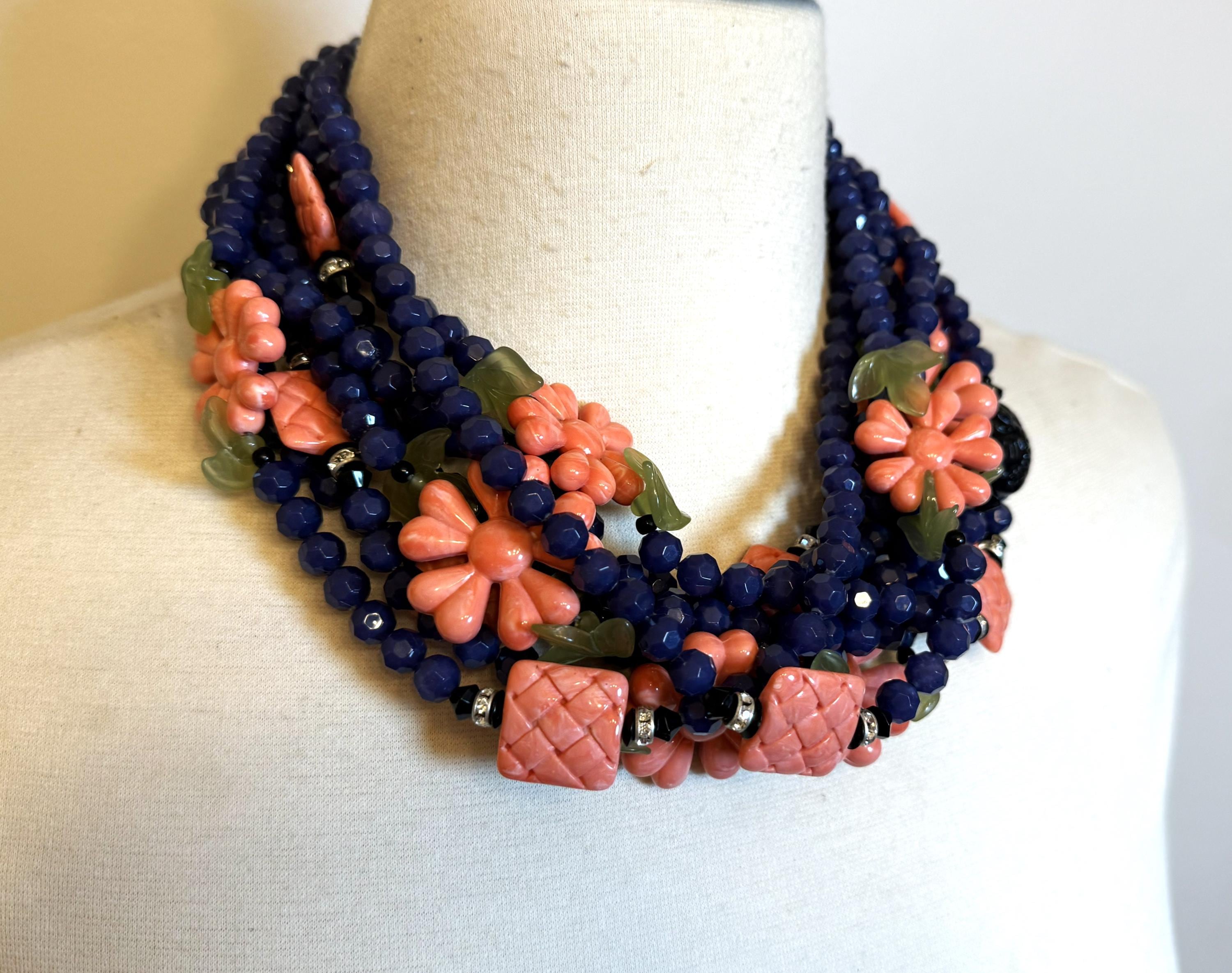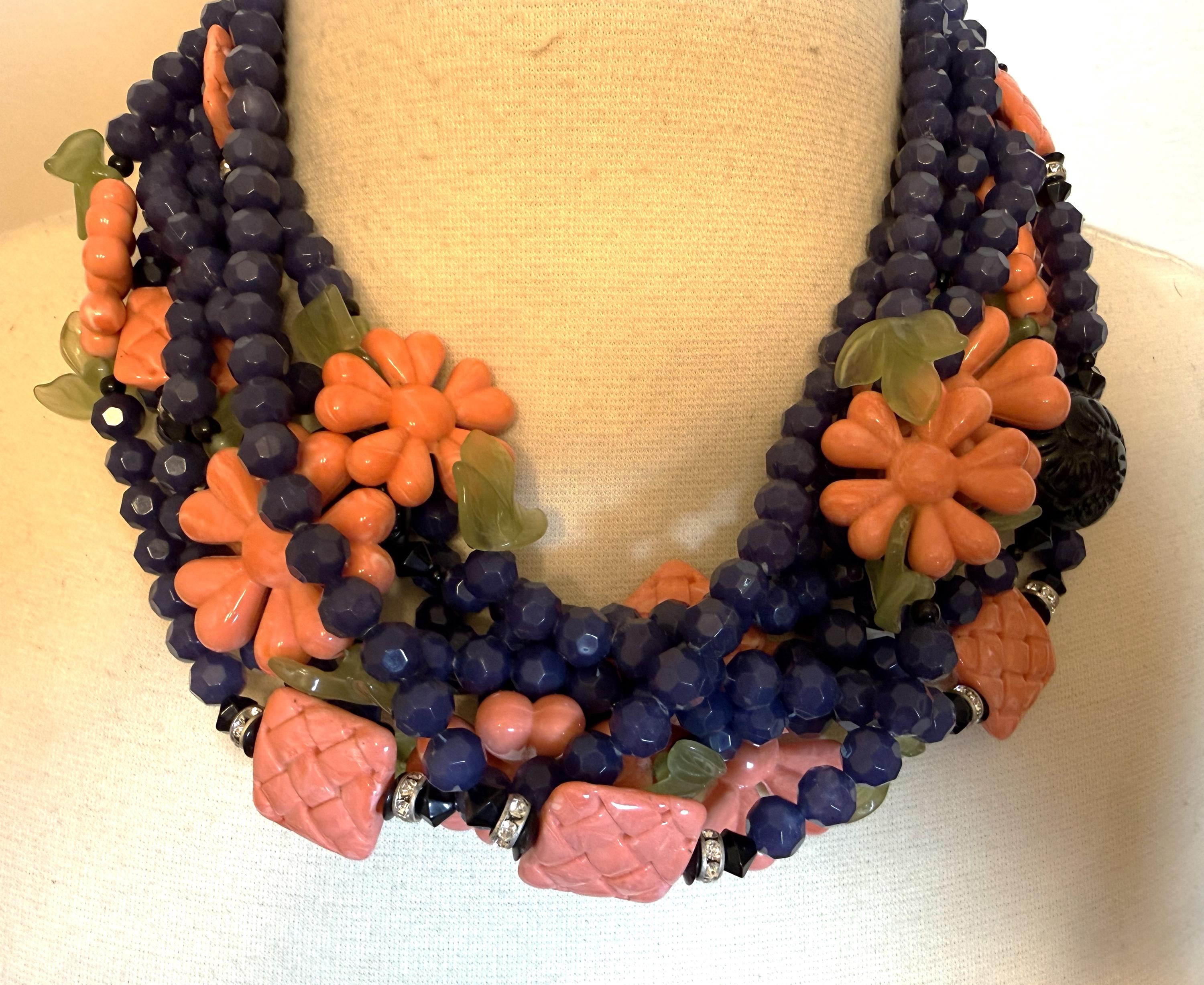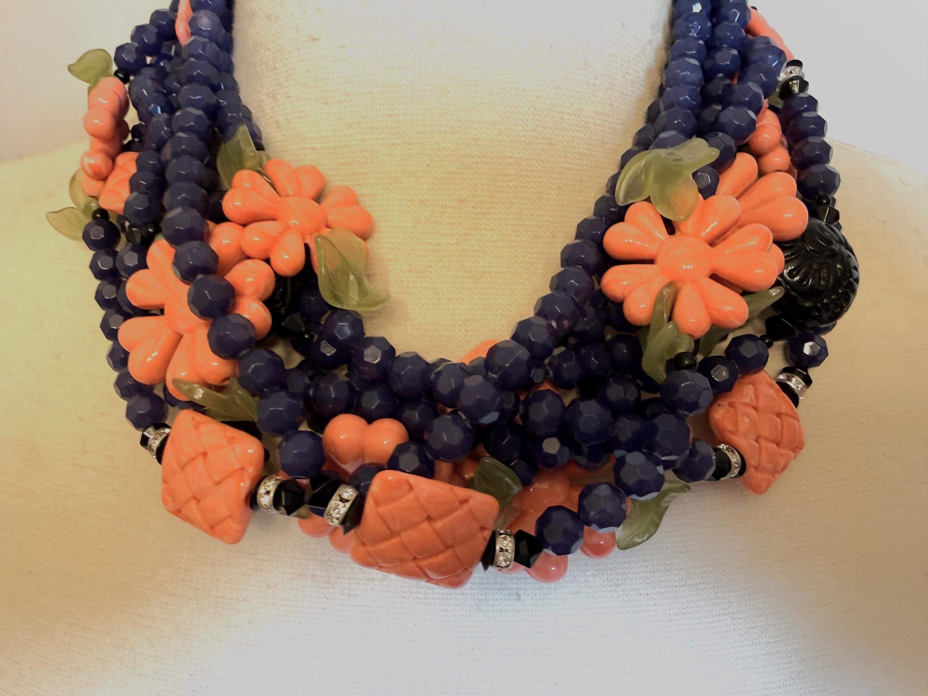 Gorgeous ANGELA CAPUTI Blue & Coral Color Resin Flowers Beads Necklace