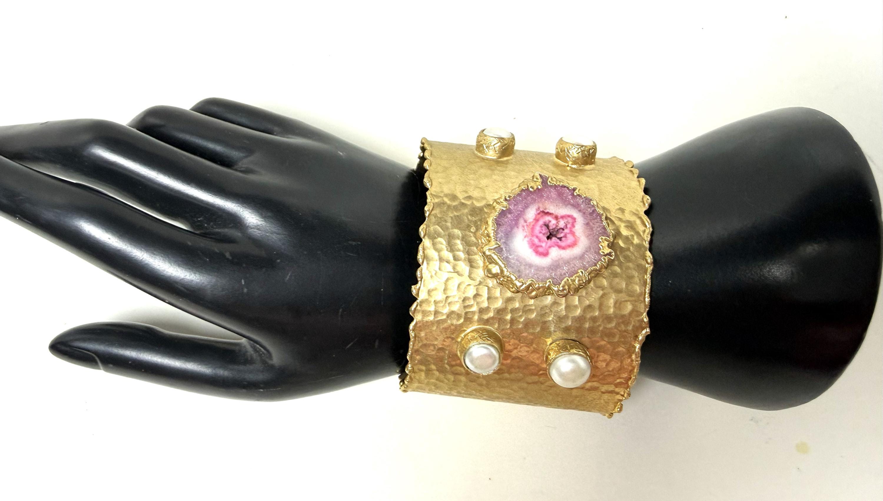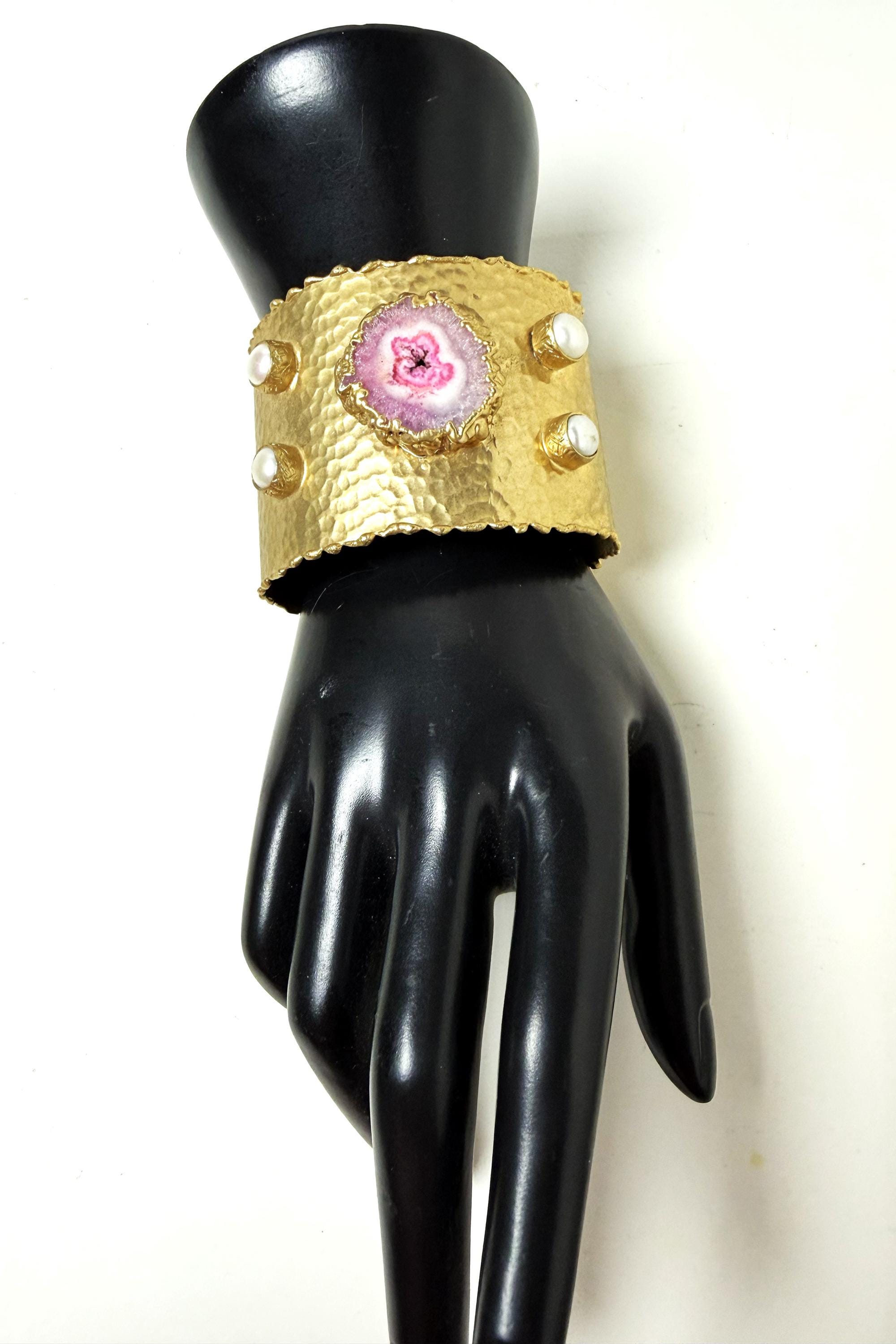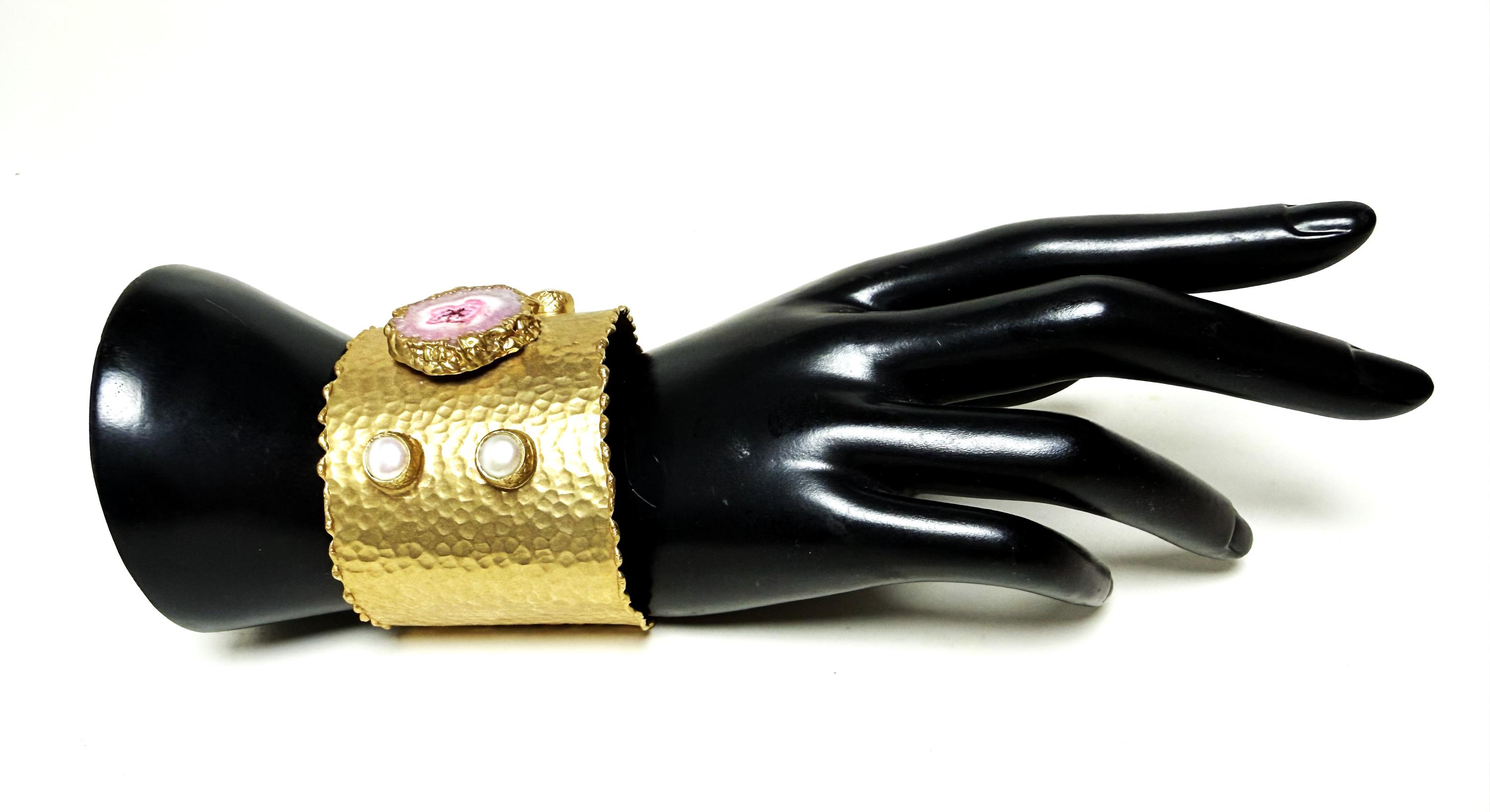 Gorgeous Hand Hammered Satin Gold Tone, Faux Pearl & Pink Quartz Cuff Bracelet, measure 2" wide.