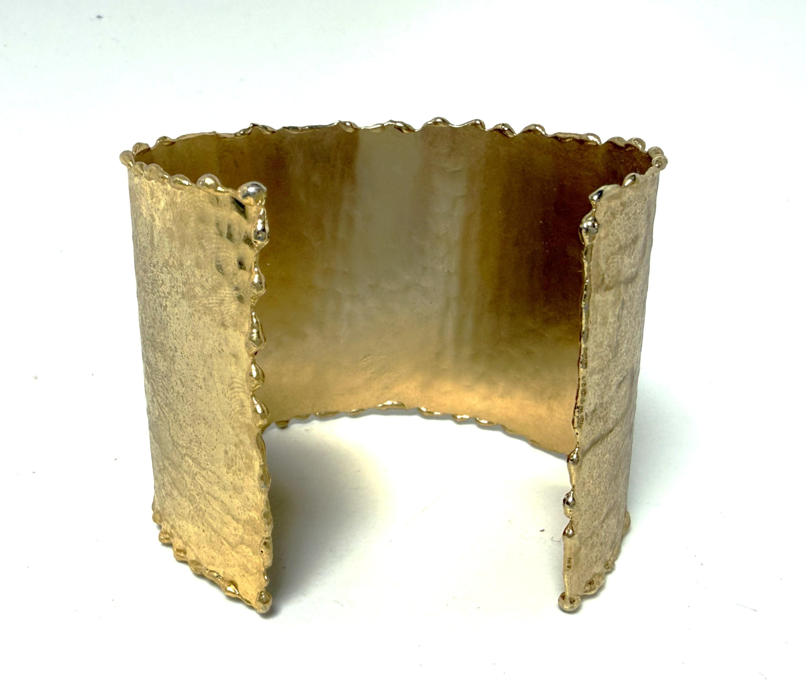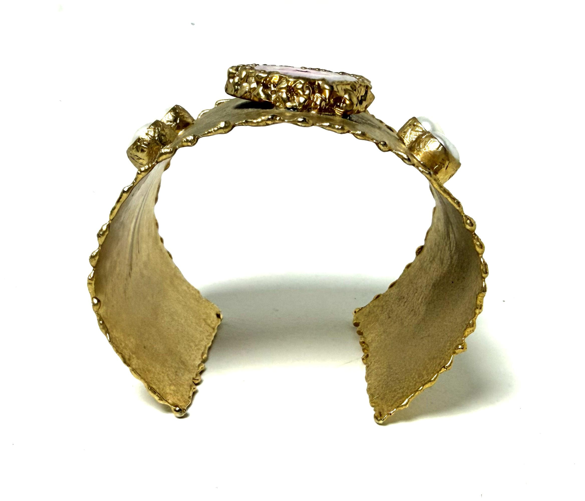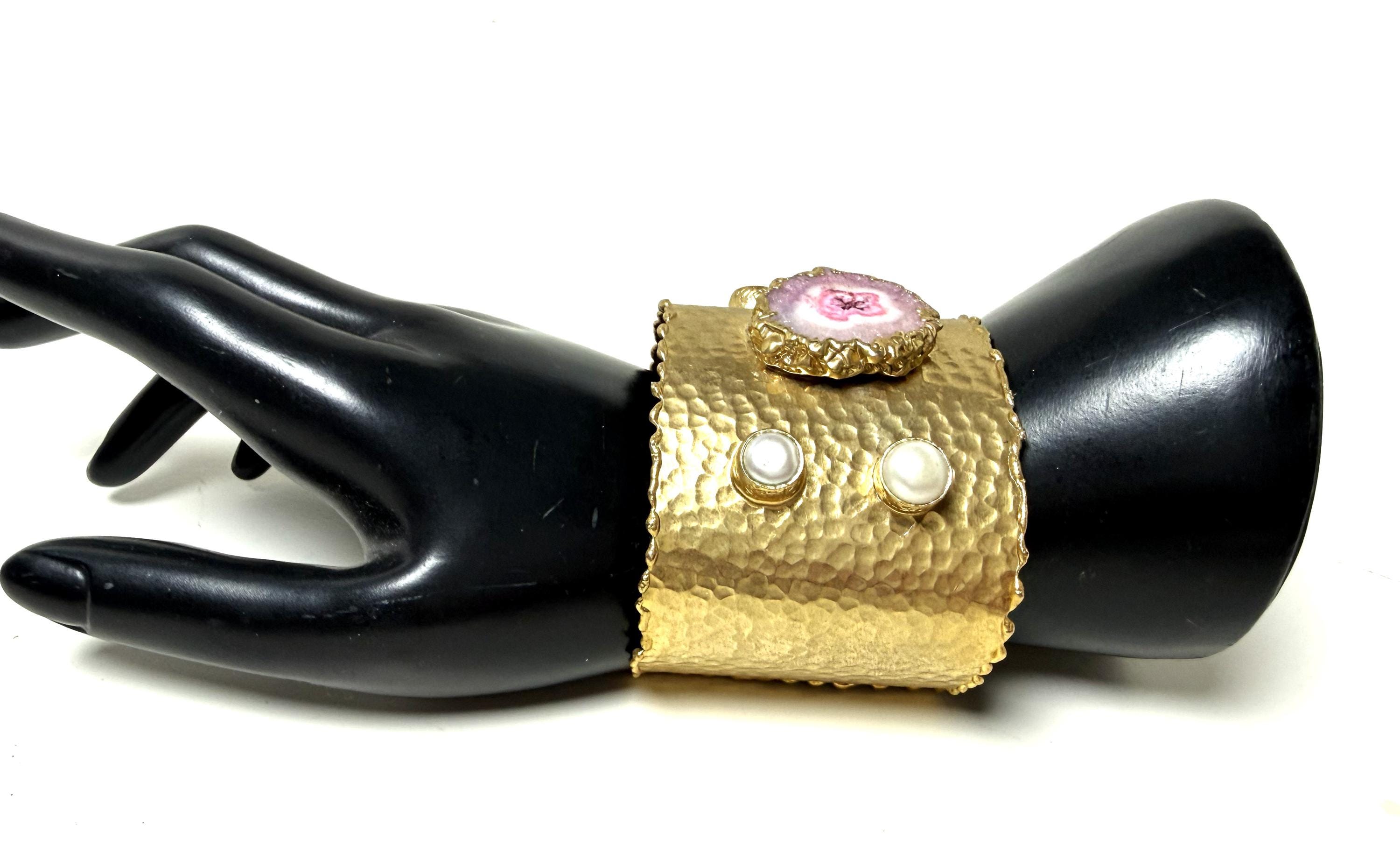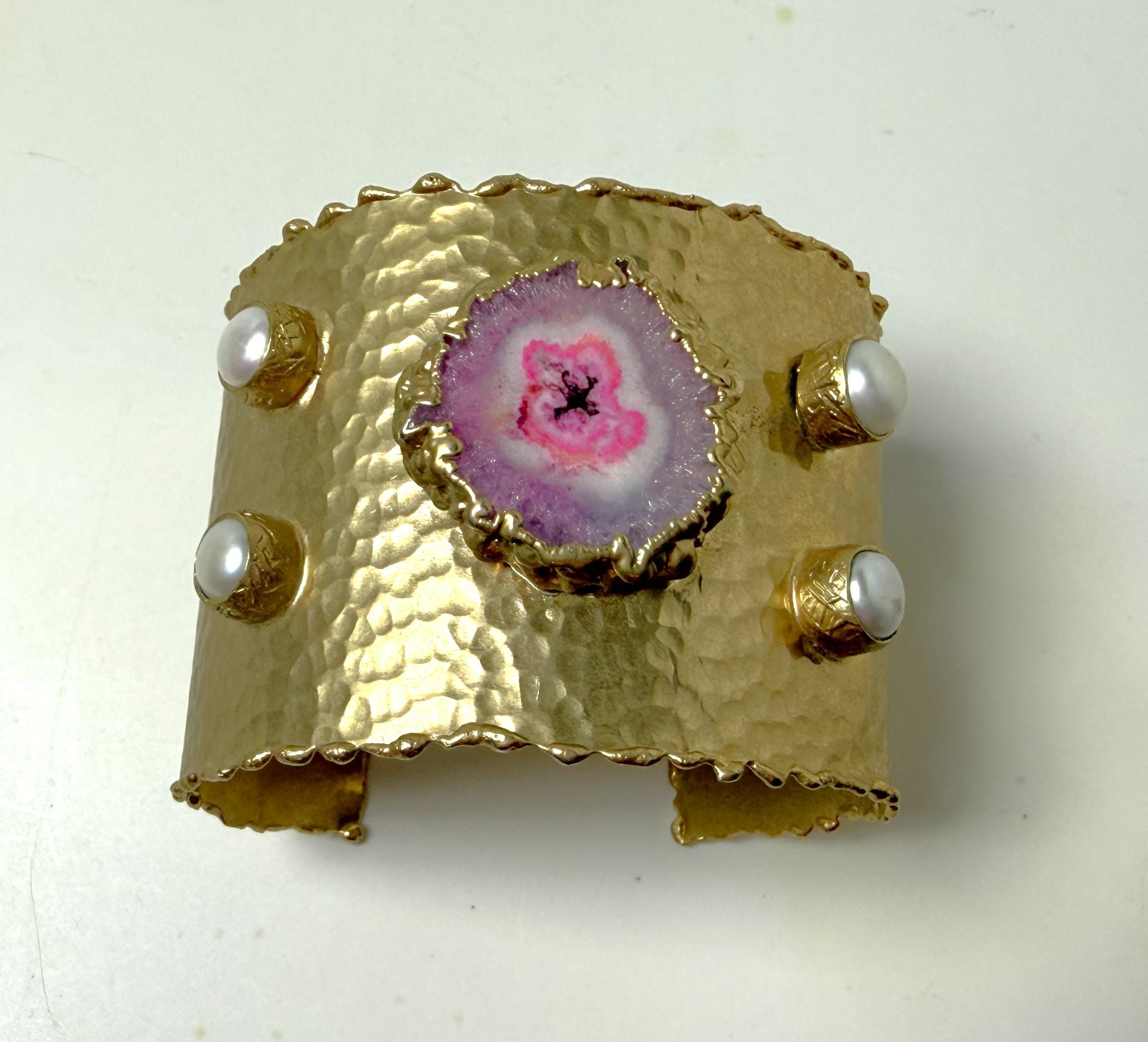Gorgeous Hand Hammered Satin Gold Tone, Faux Pearl & Pink Quartz Cuff Bracelet, measure 2" wide.