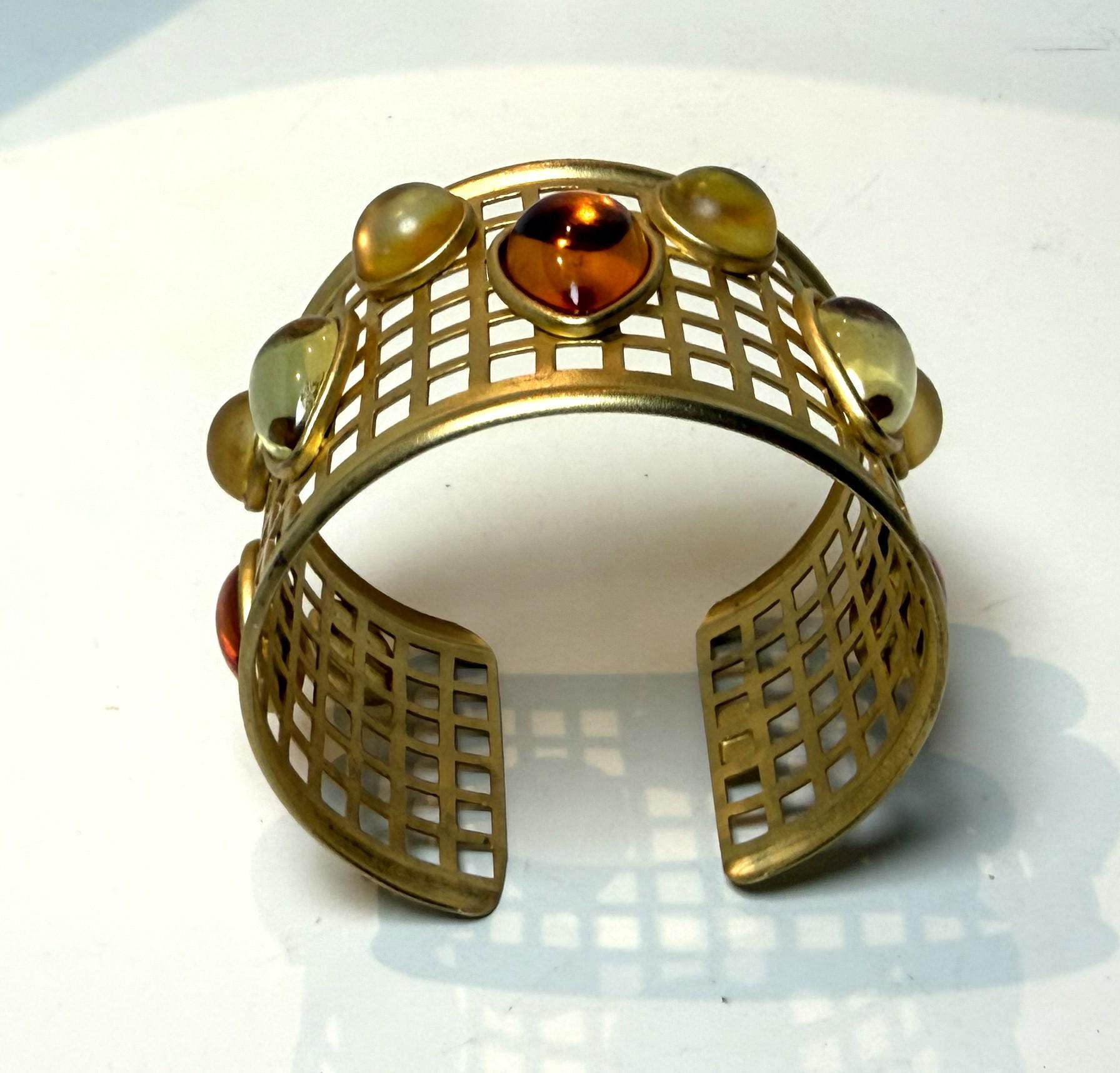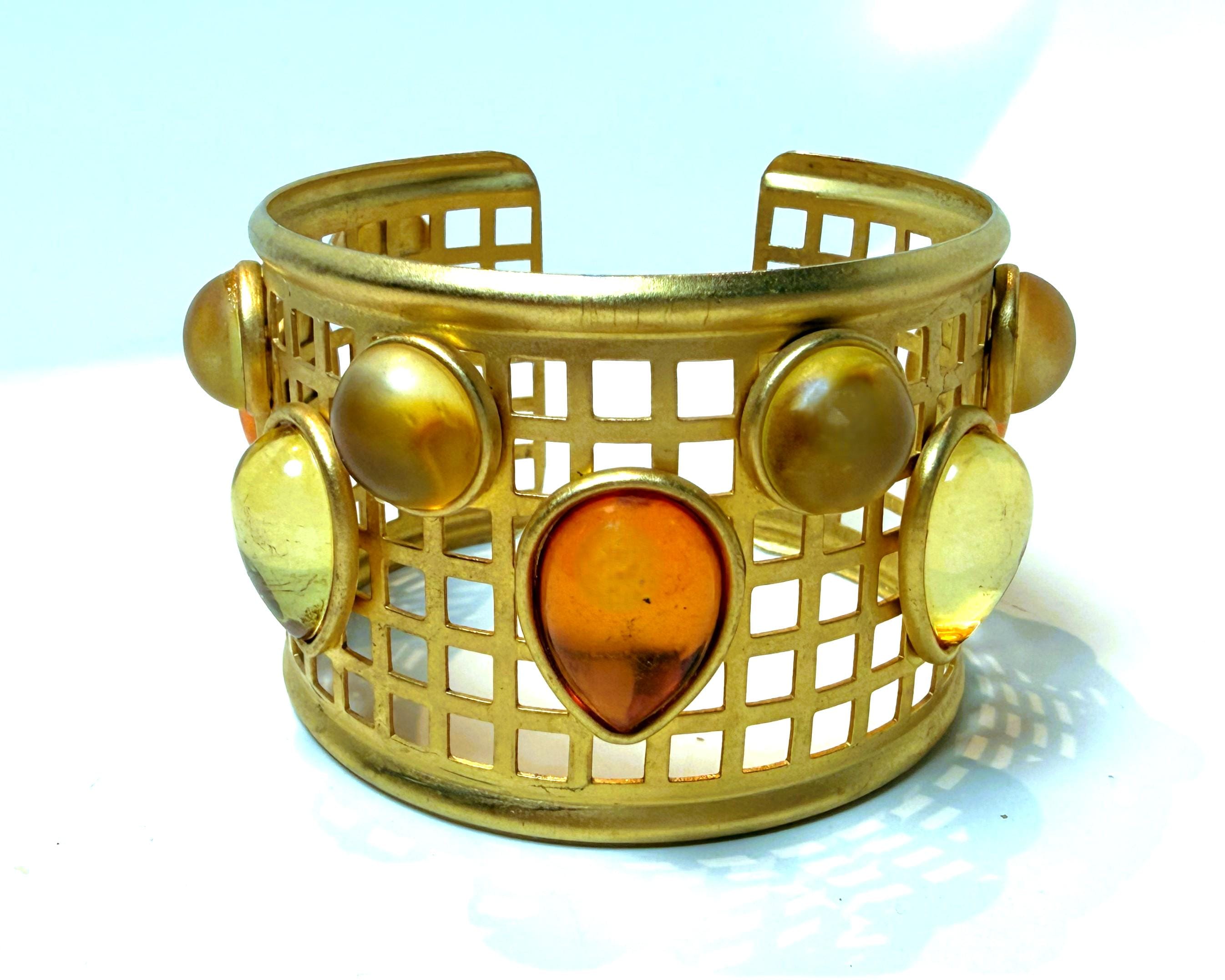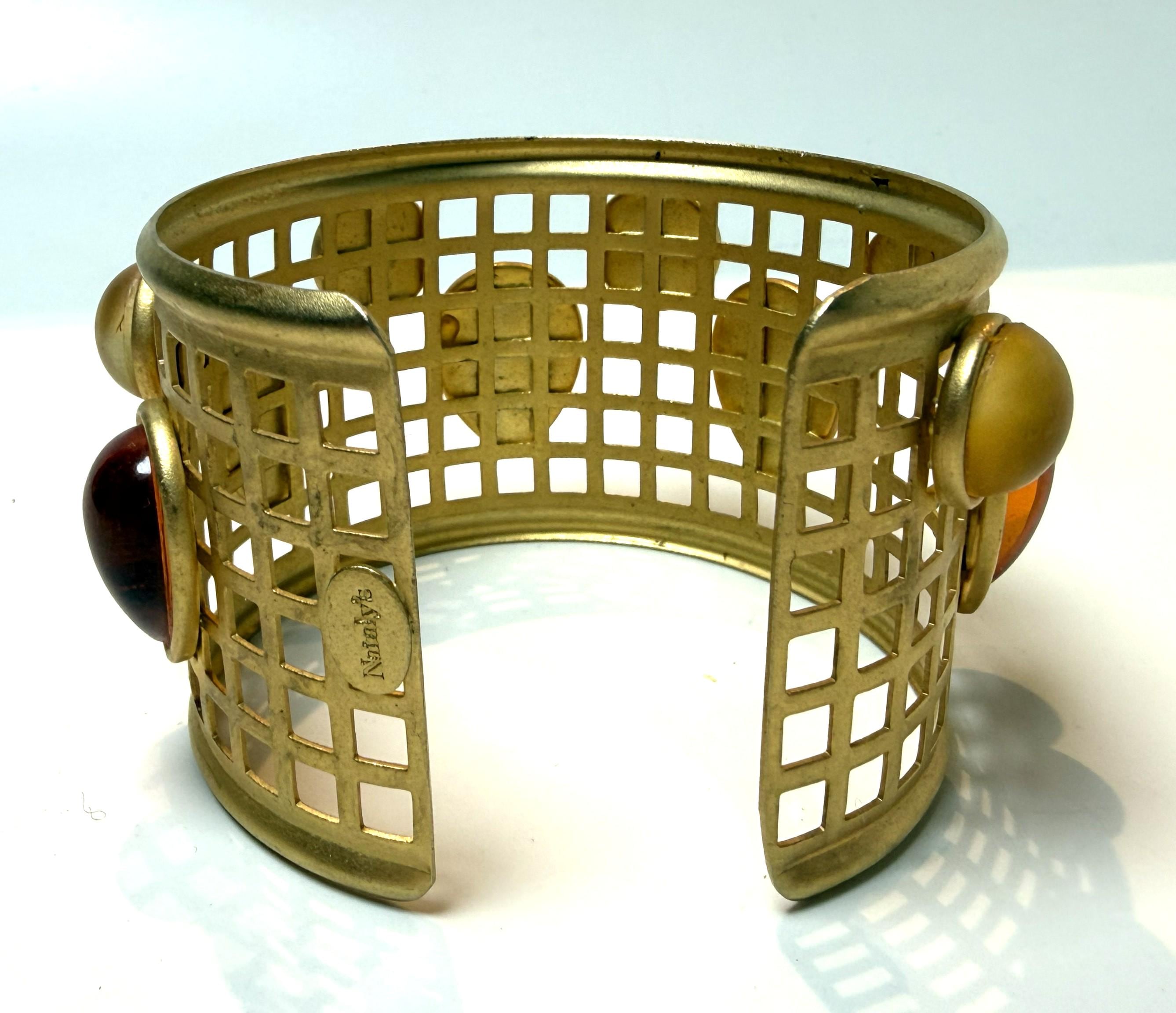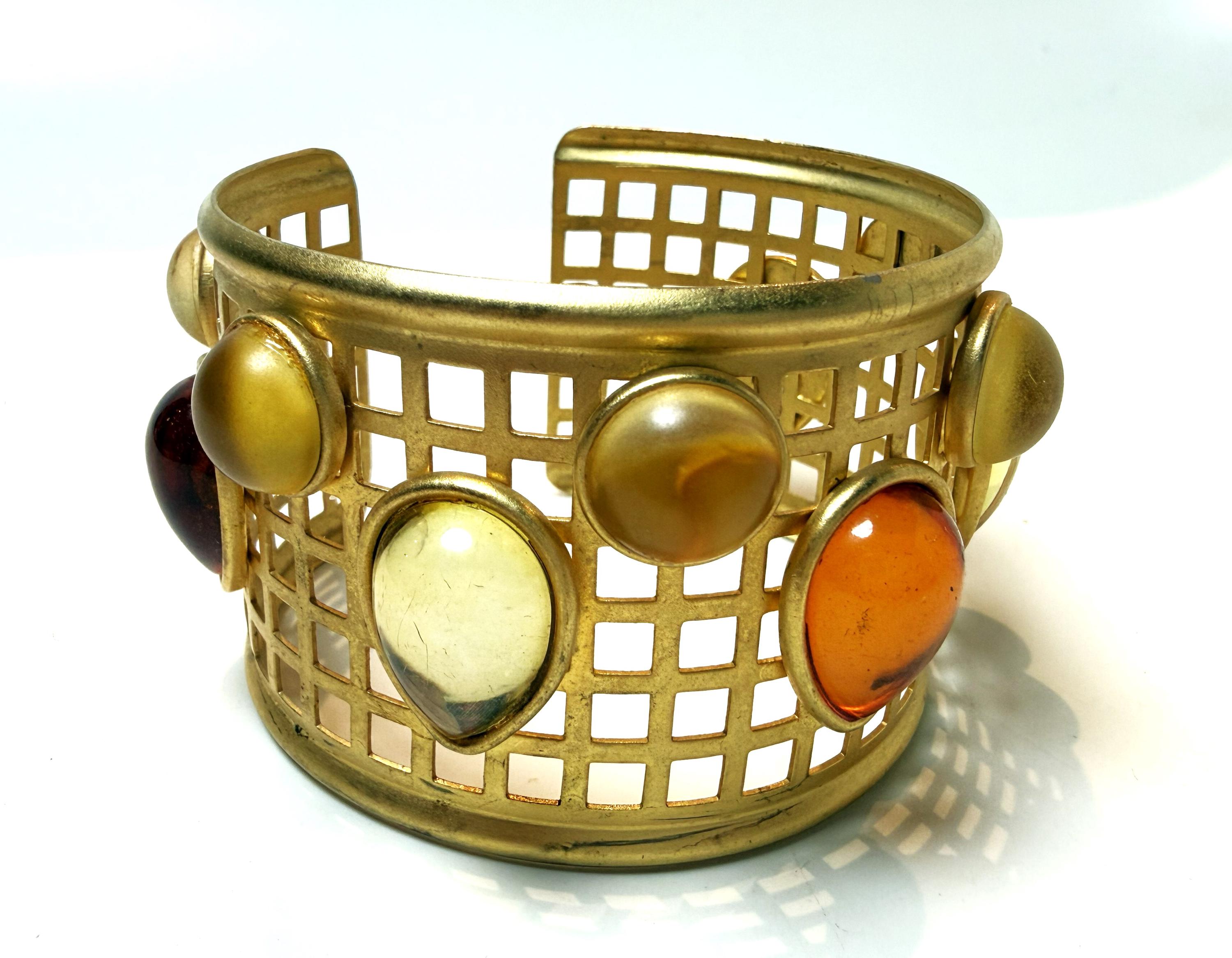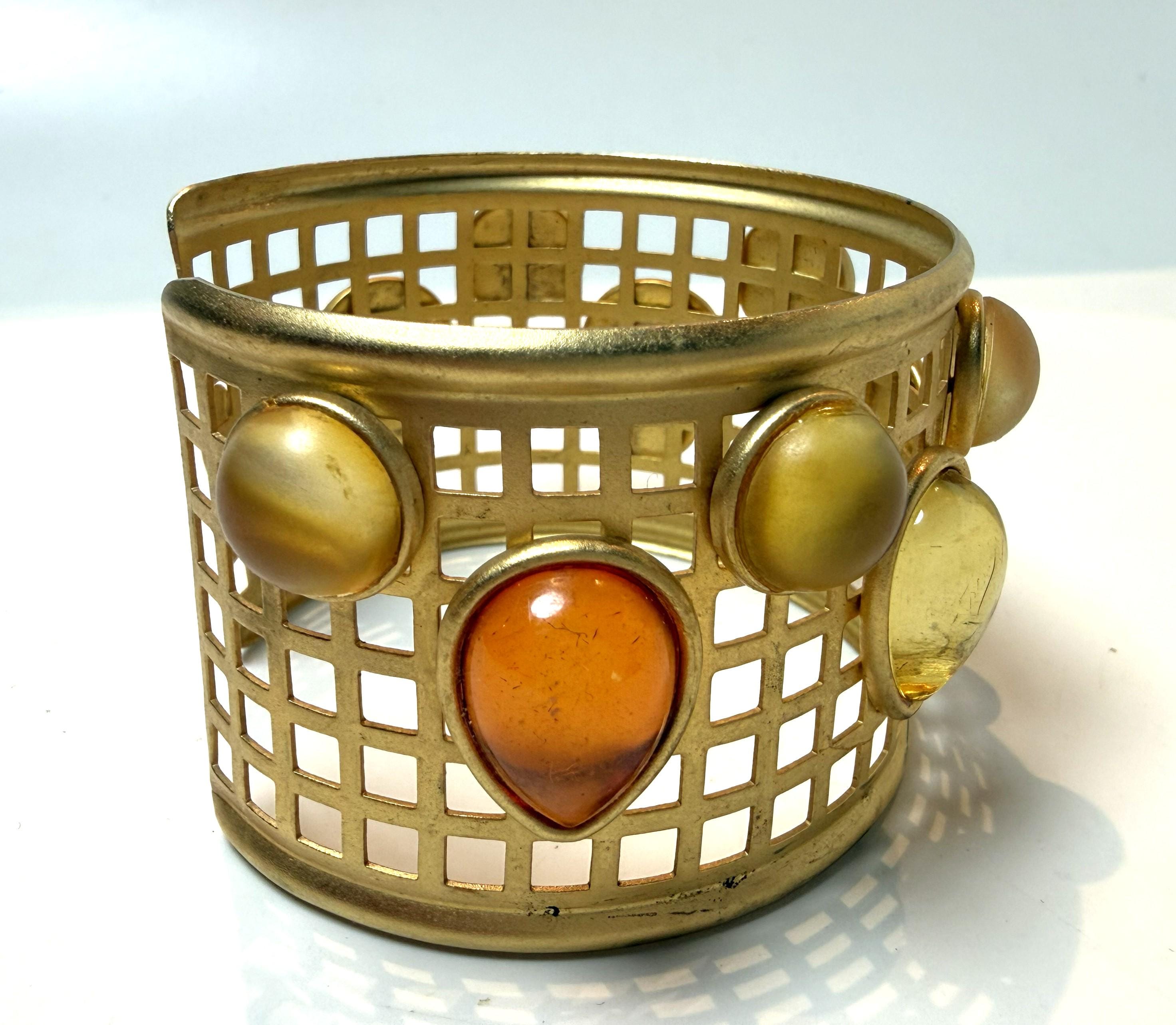 Signed Nataly's Satin Gold Tone, Acrylic Clear, Brown & Yellow Cabochon Cuff Bracelet, measure 1.75" wide.