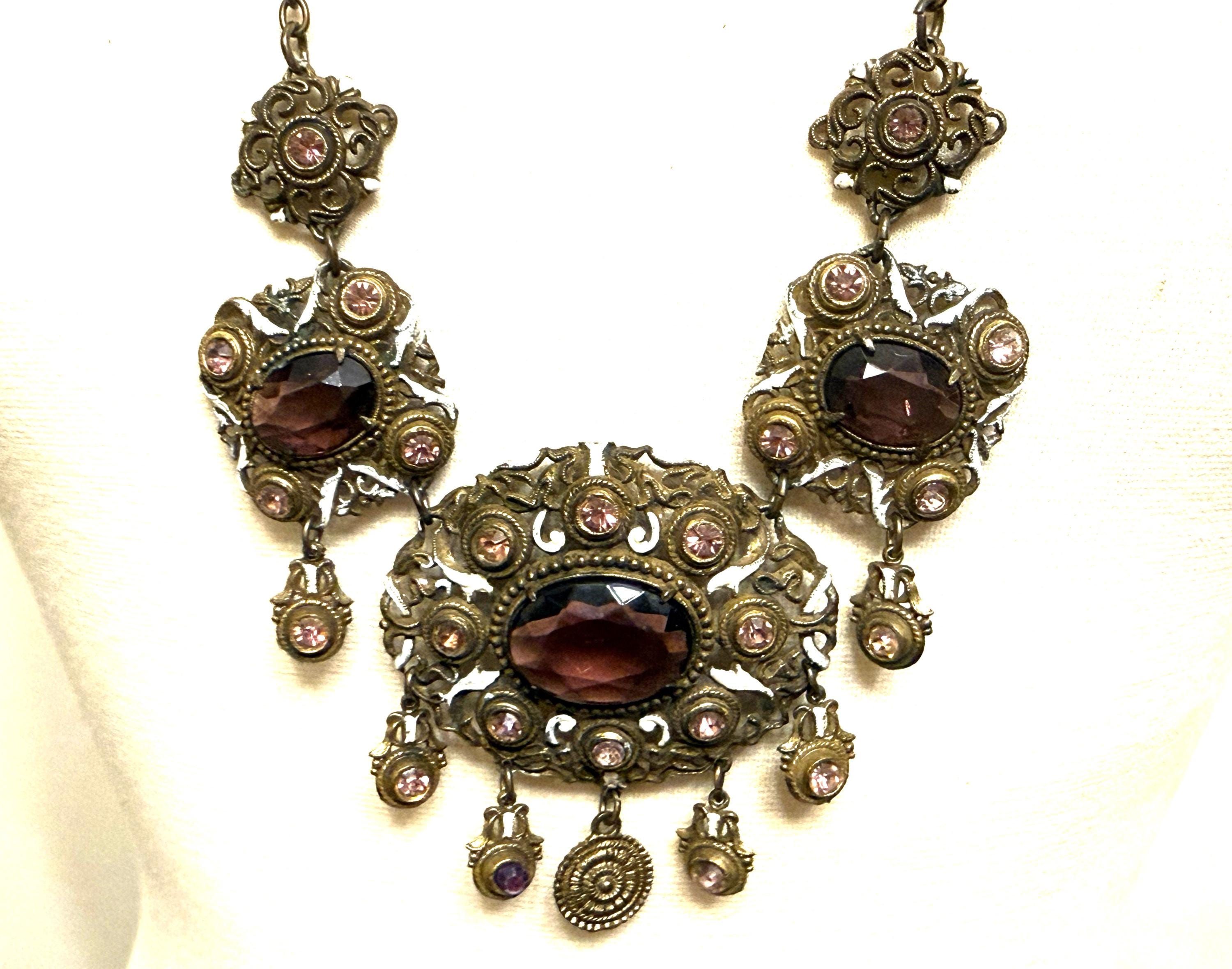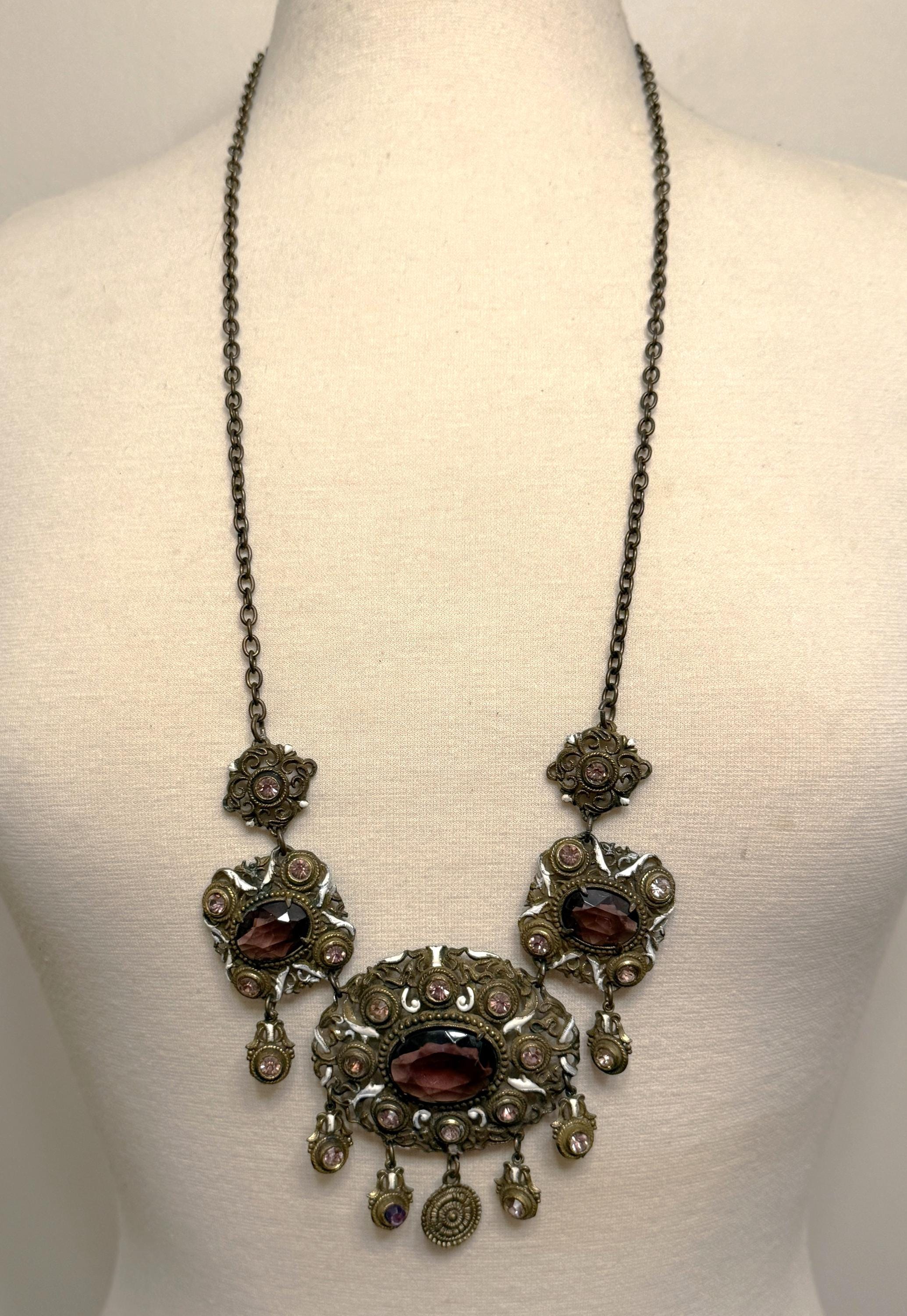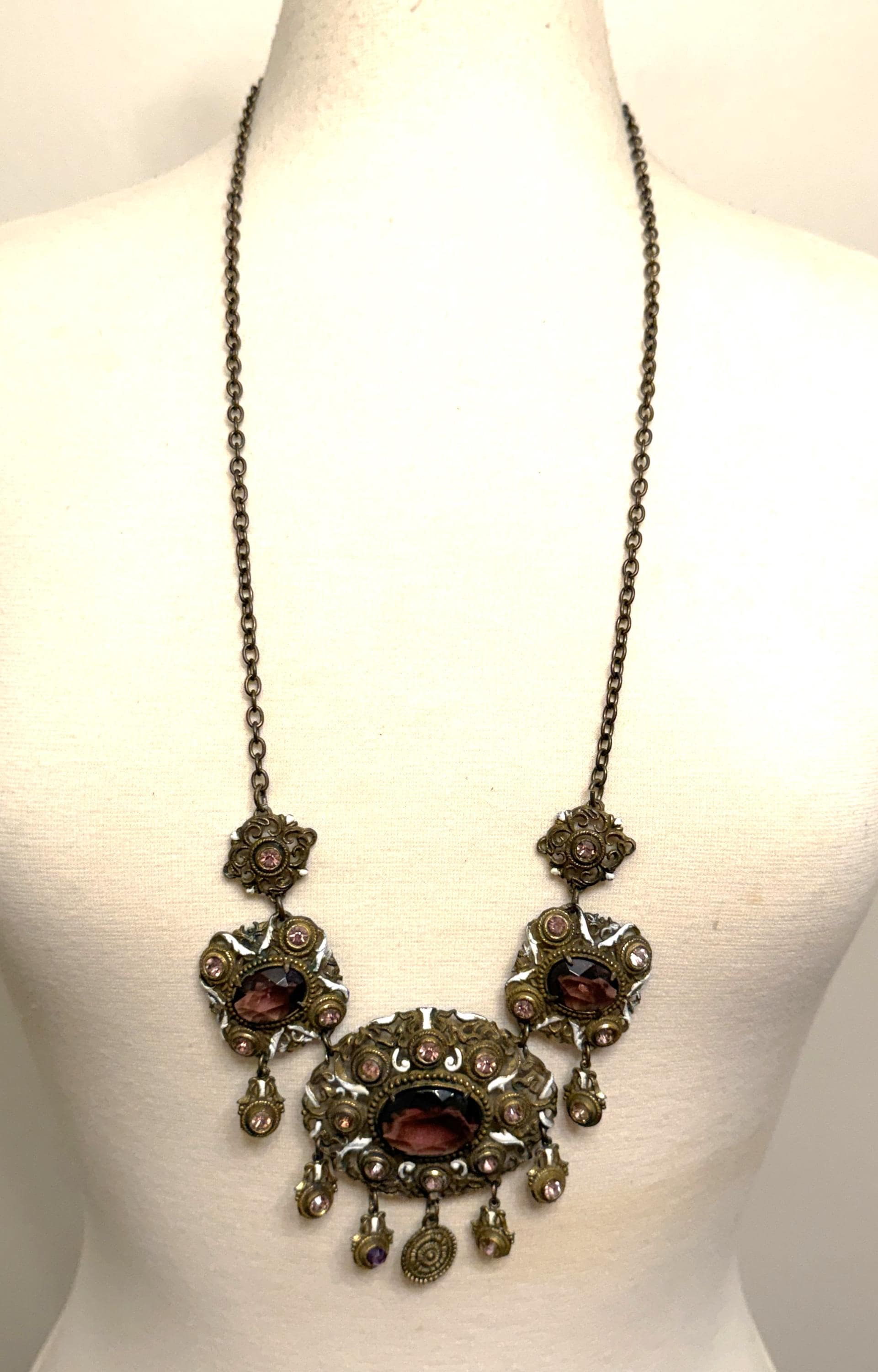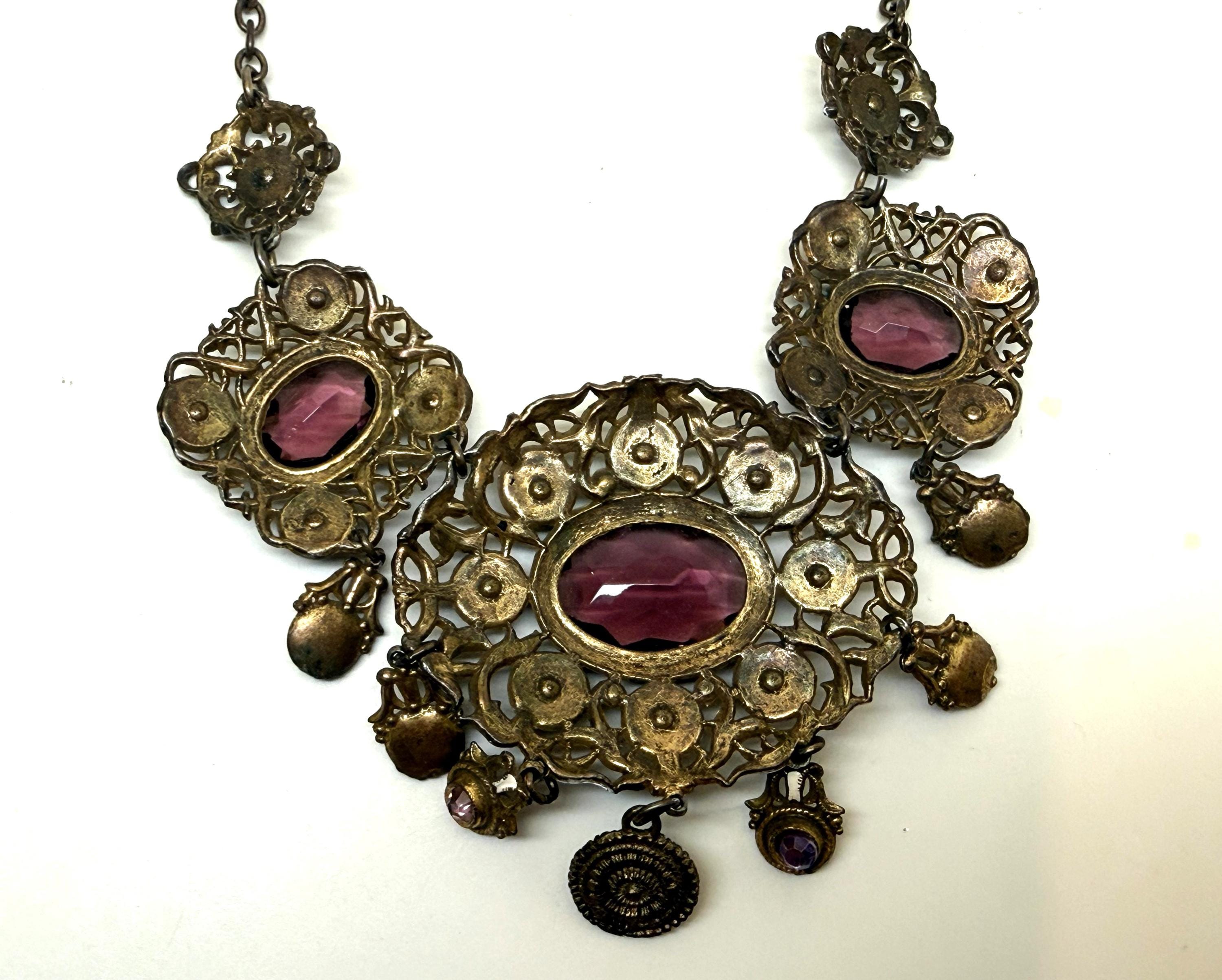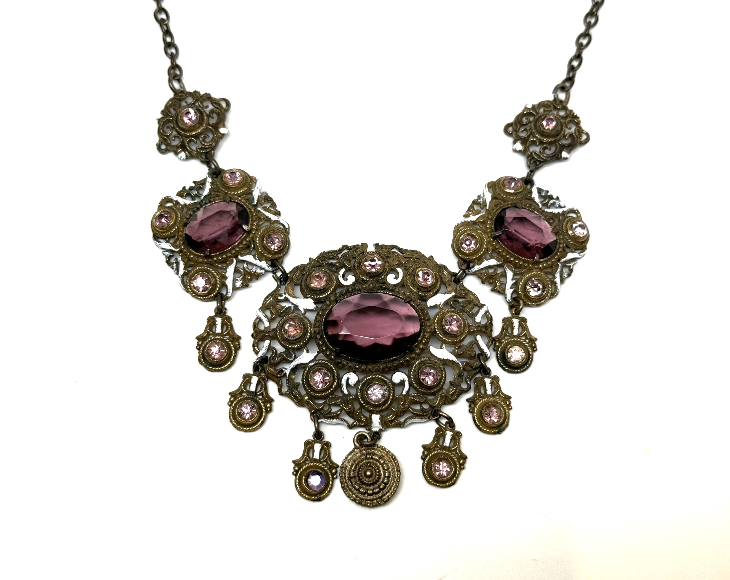 Vintage Filigree Enamel Large Amethyst Color Rhinestone Czech Necklace