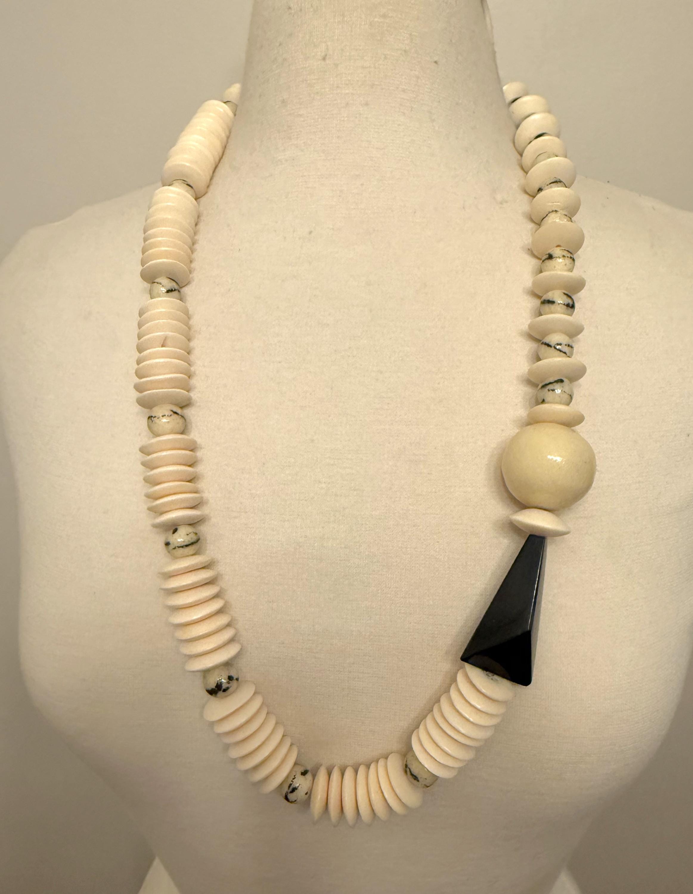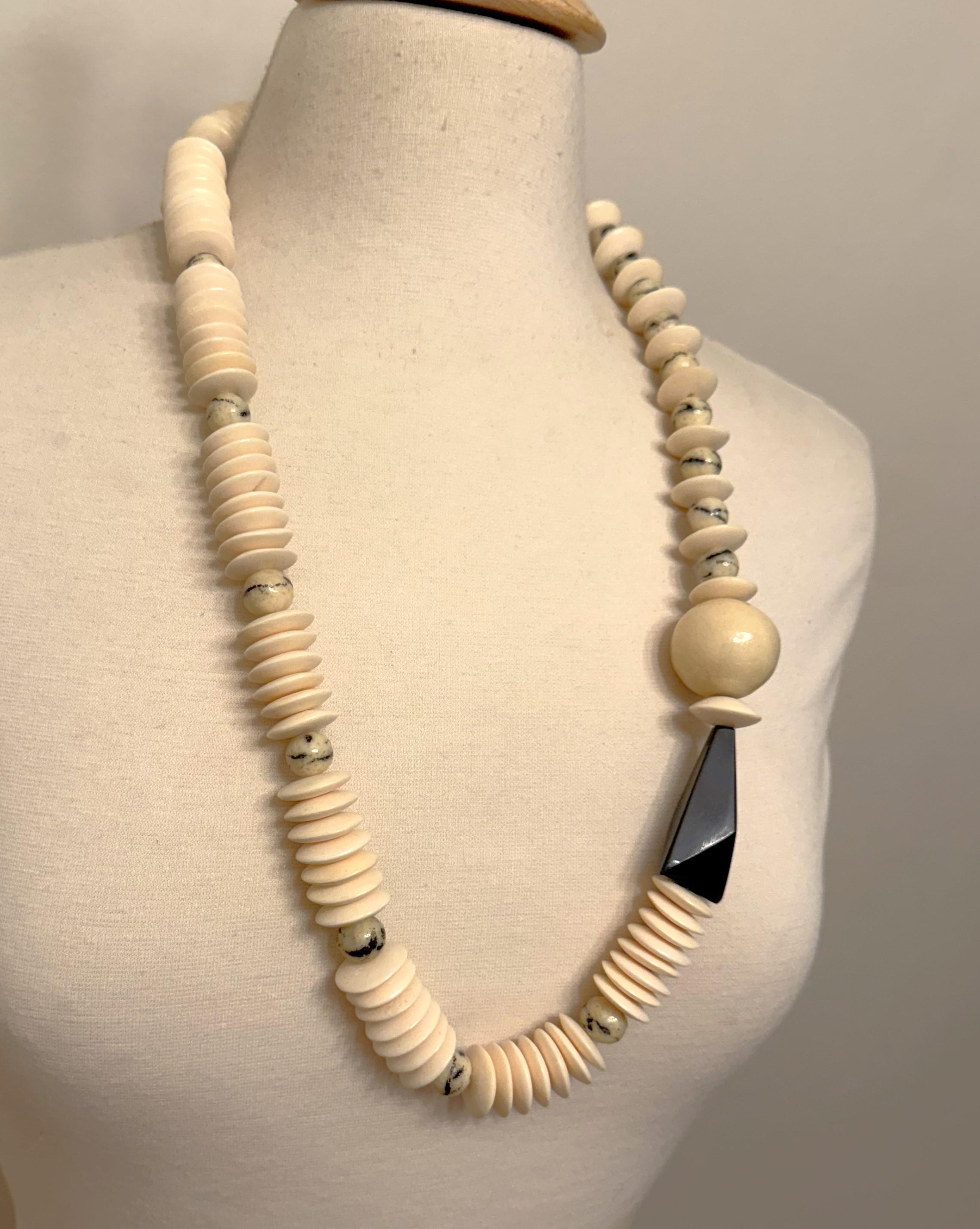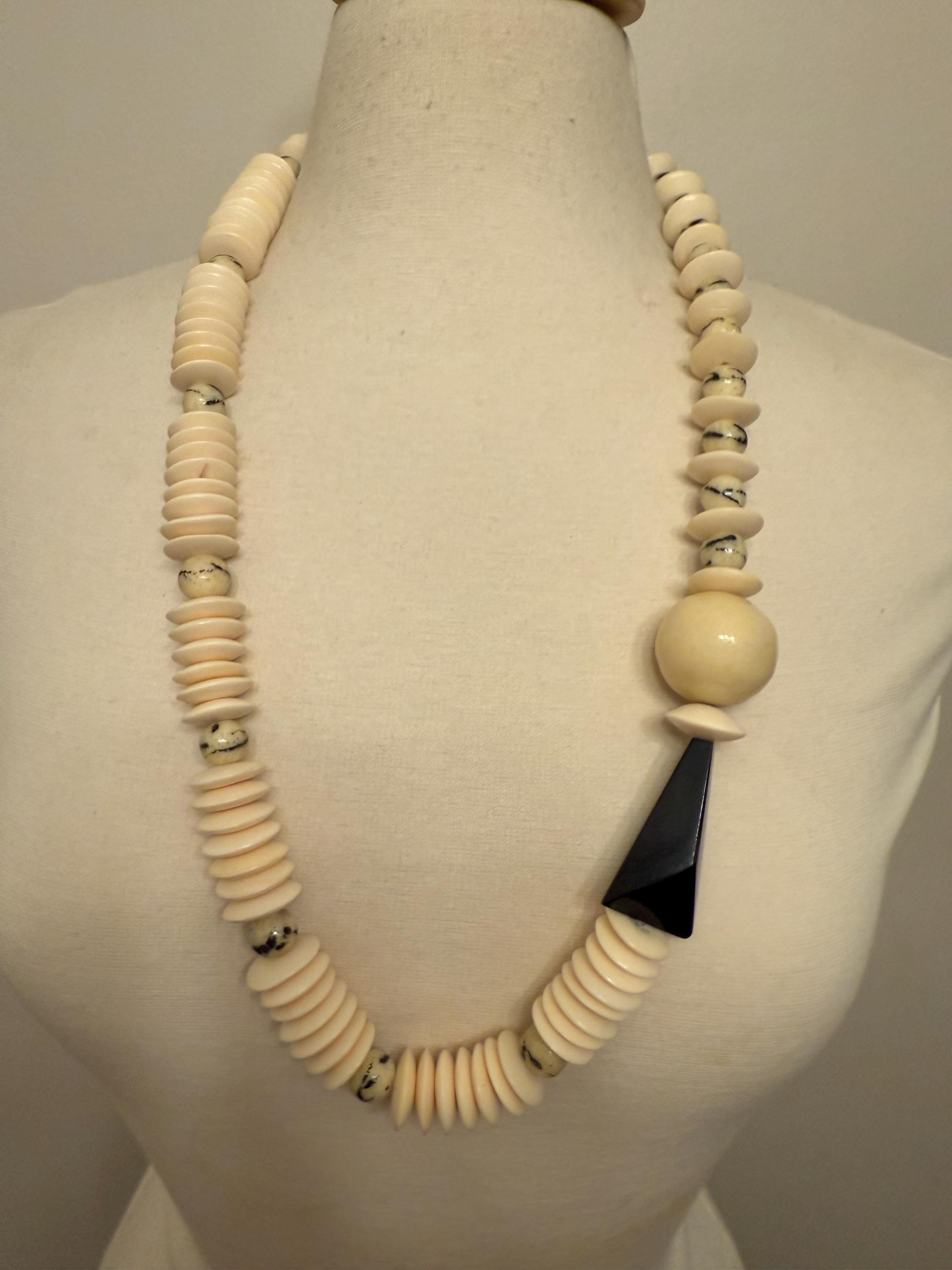 Vintage Statement Cream Color Resin & Wood Long Necklace
